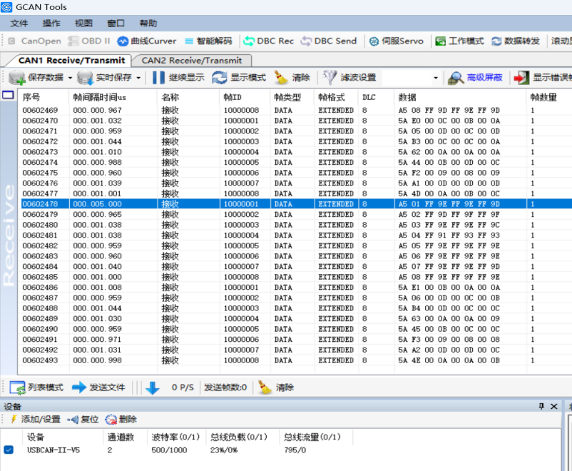 The CAN communication utilized IDs 10000001 to 10000008, covering all eight units, with a baud rate of 500 kbps.